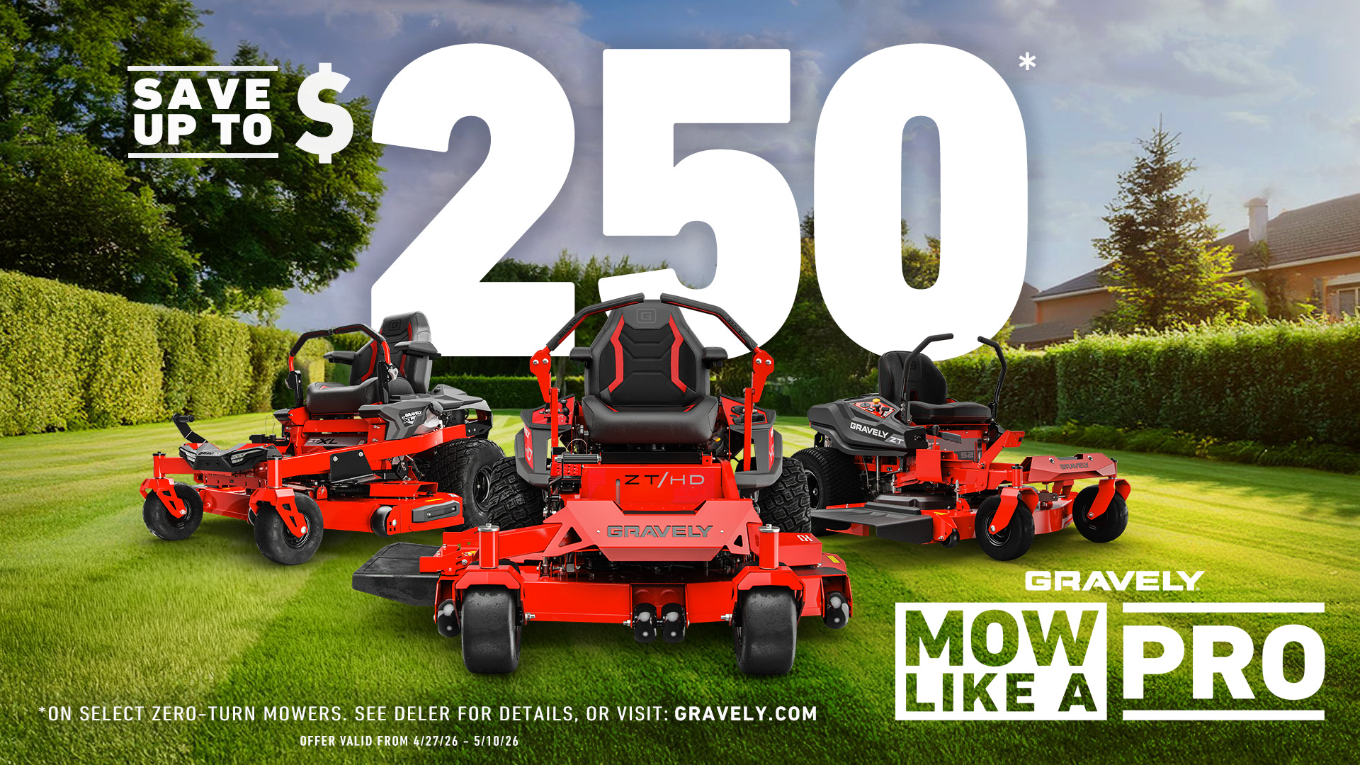 Get up to $250 off the Gravely residential zero-turn lawn mower lineup for a limited time during the Mow Like a Pro Sales Event.